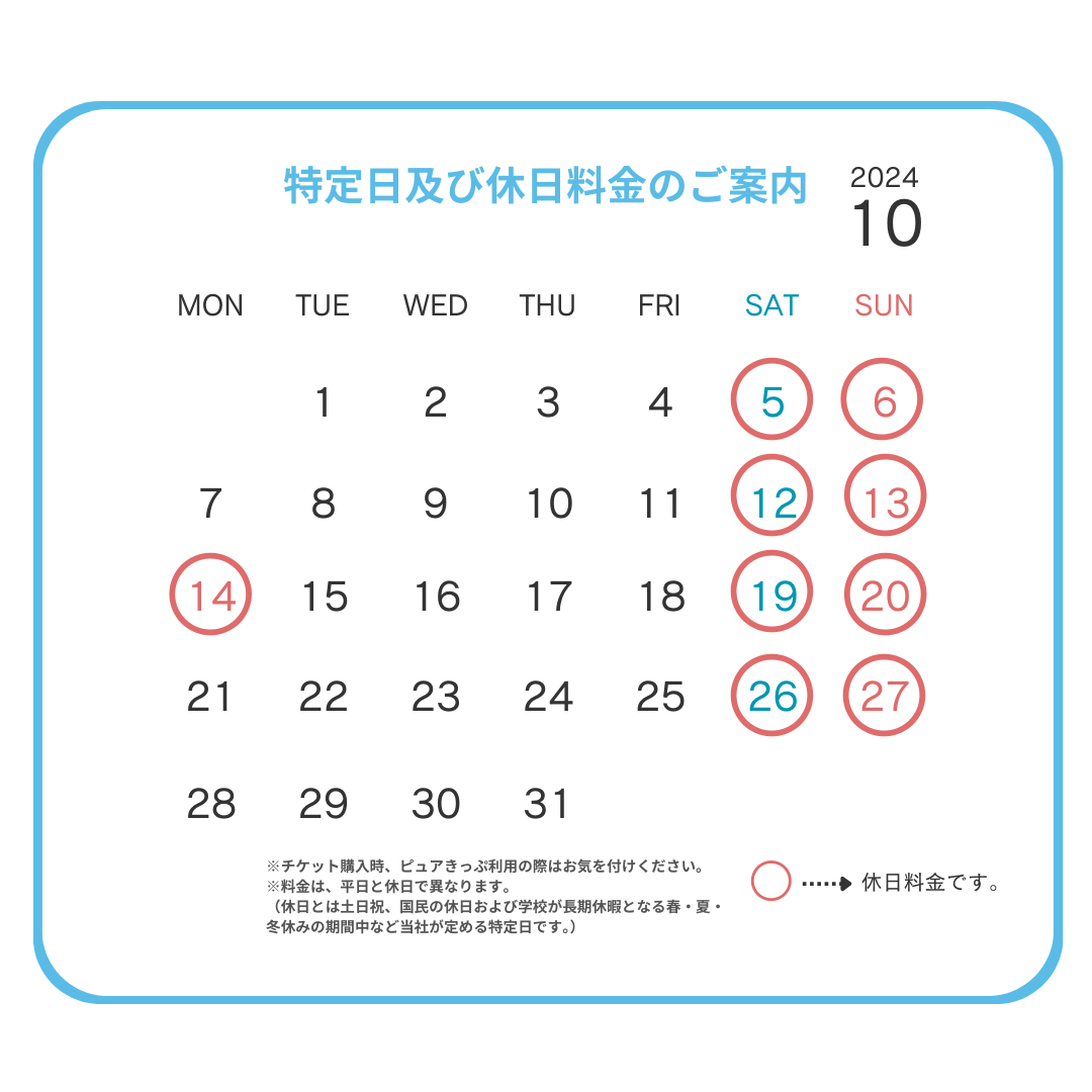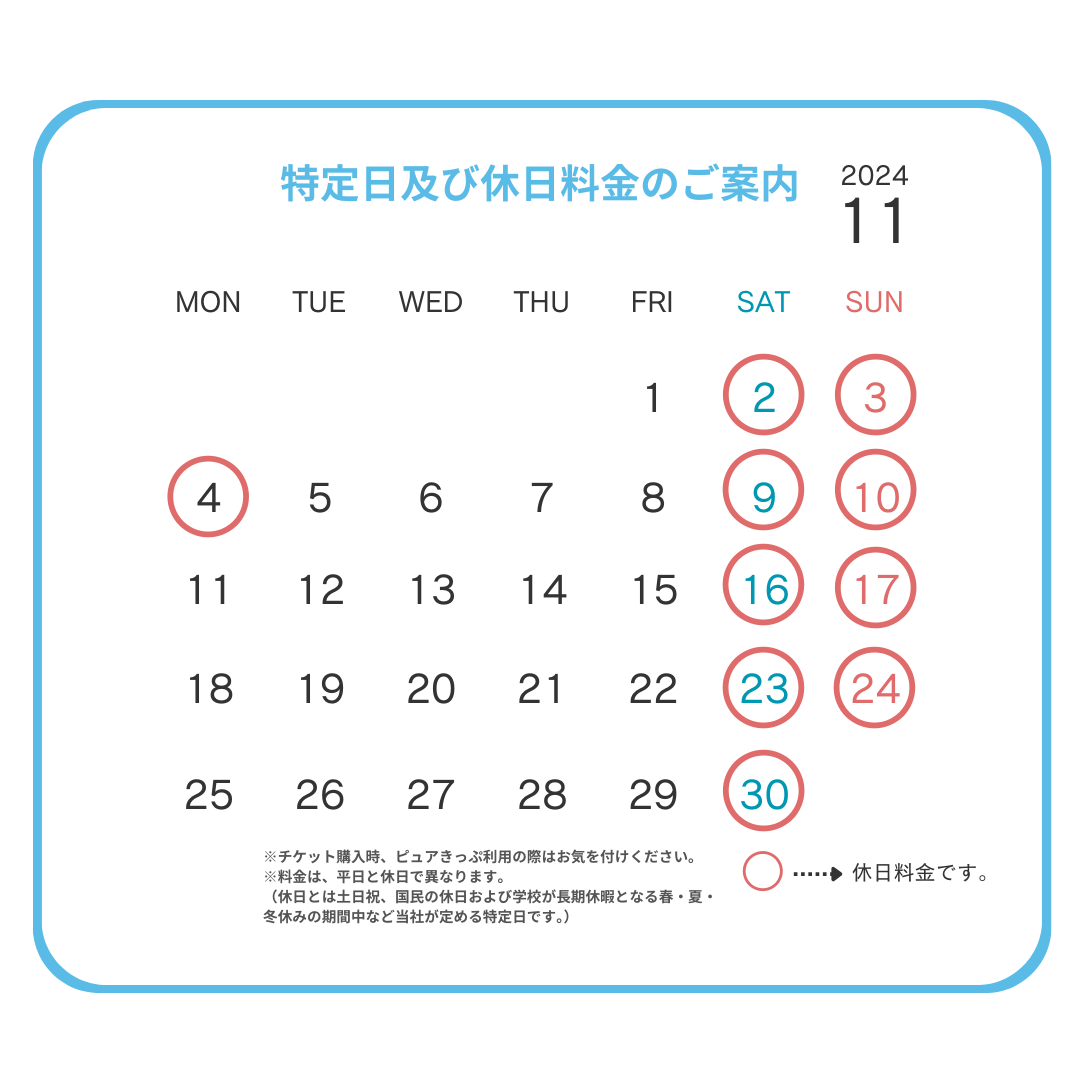ピュアキッズより休日料金の日程のお知らせです。