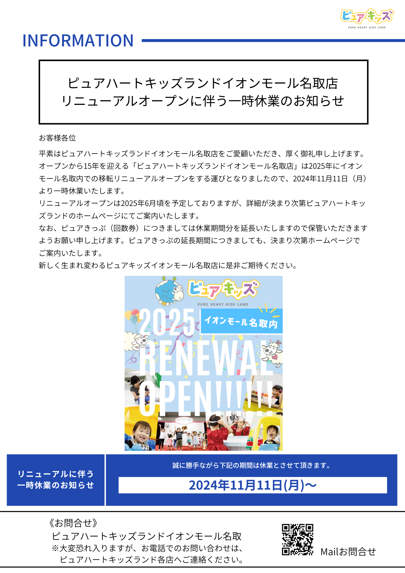 ピュアハートキッズランドイオンモール名取店リニューアルオープンに伴う一時休業のお知らせ