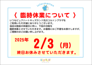 2025件2月3日(月)は、ピュアハートキッズランド市川コルトンプラザ店は