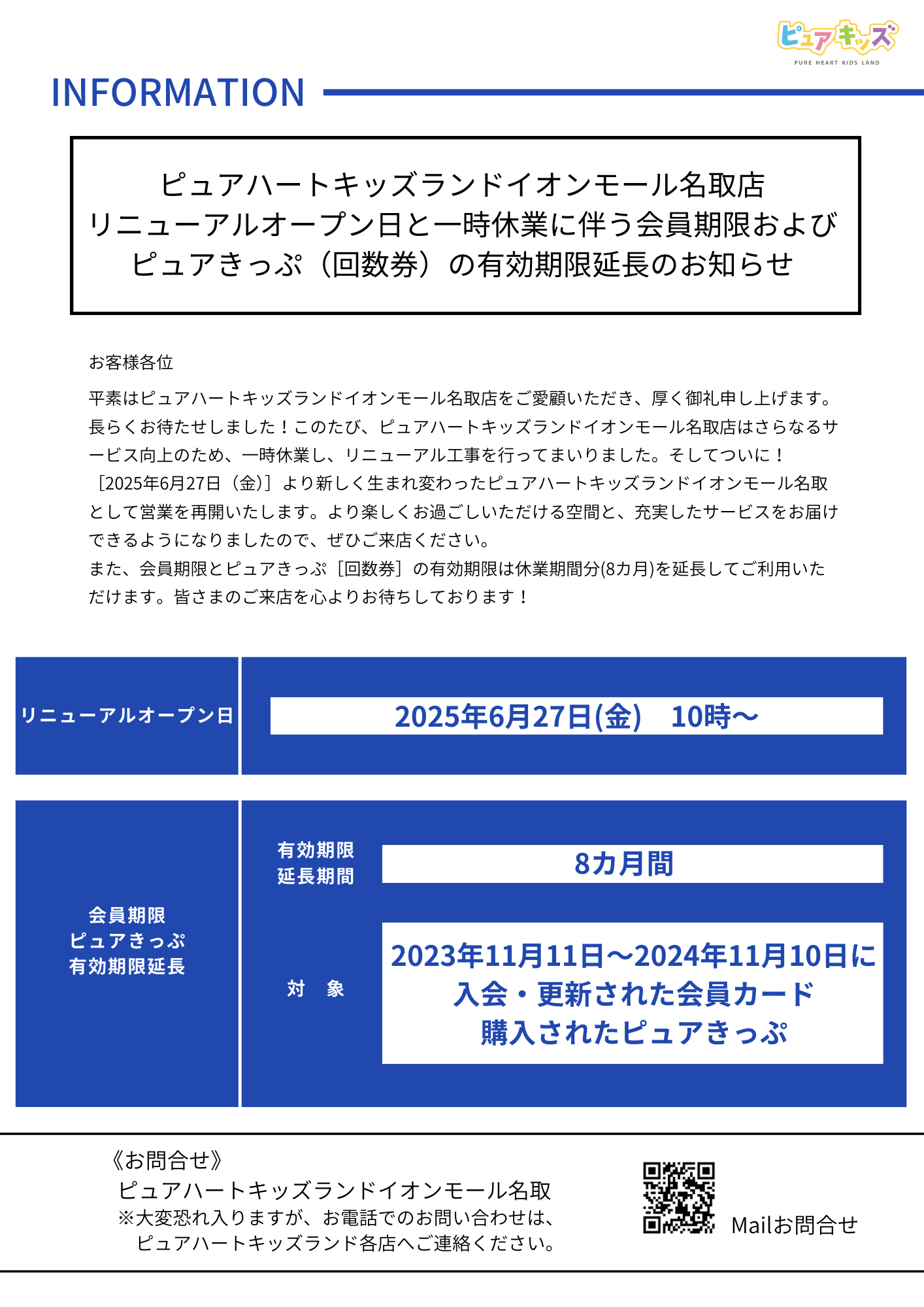 このたび、ピュアハートキッズランドイオンモール名取店は