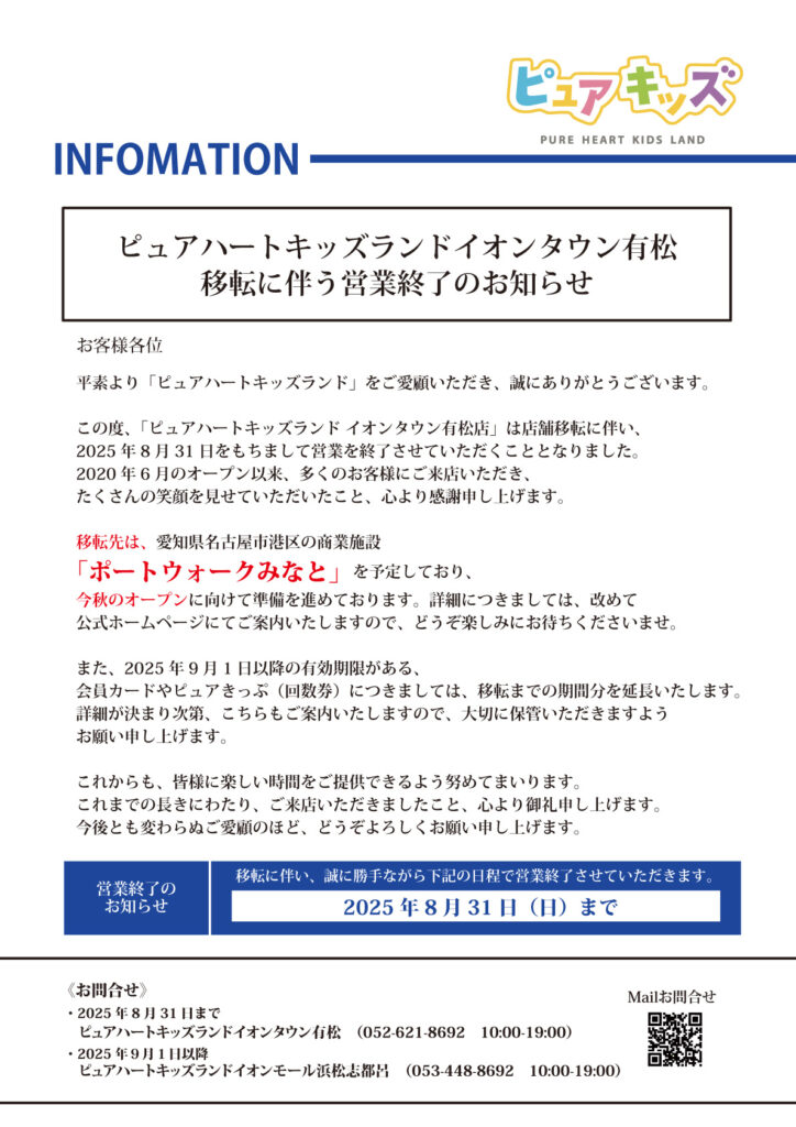 この度、「ピュアハートキッズランド イオンタウン有松店」は店舗移転に伴い、