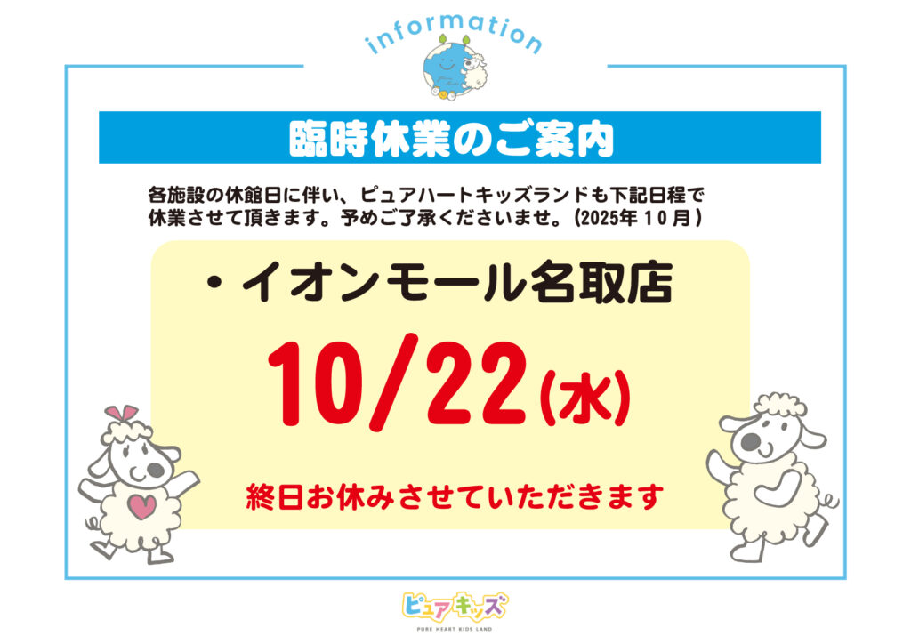 ■10月22日(水) イオンモール名取店 ・終日休業させていただき、翌日より通常通り10時より営業いたします。