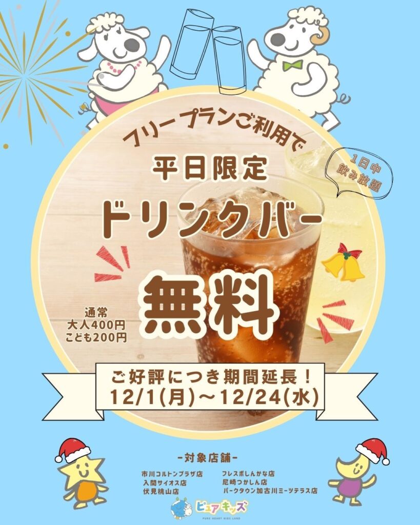 通常、大人400円・こども200円のドリンクバーが、平日フリープラン限定で無料になります!