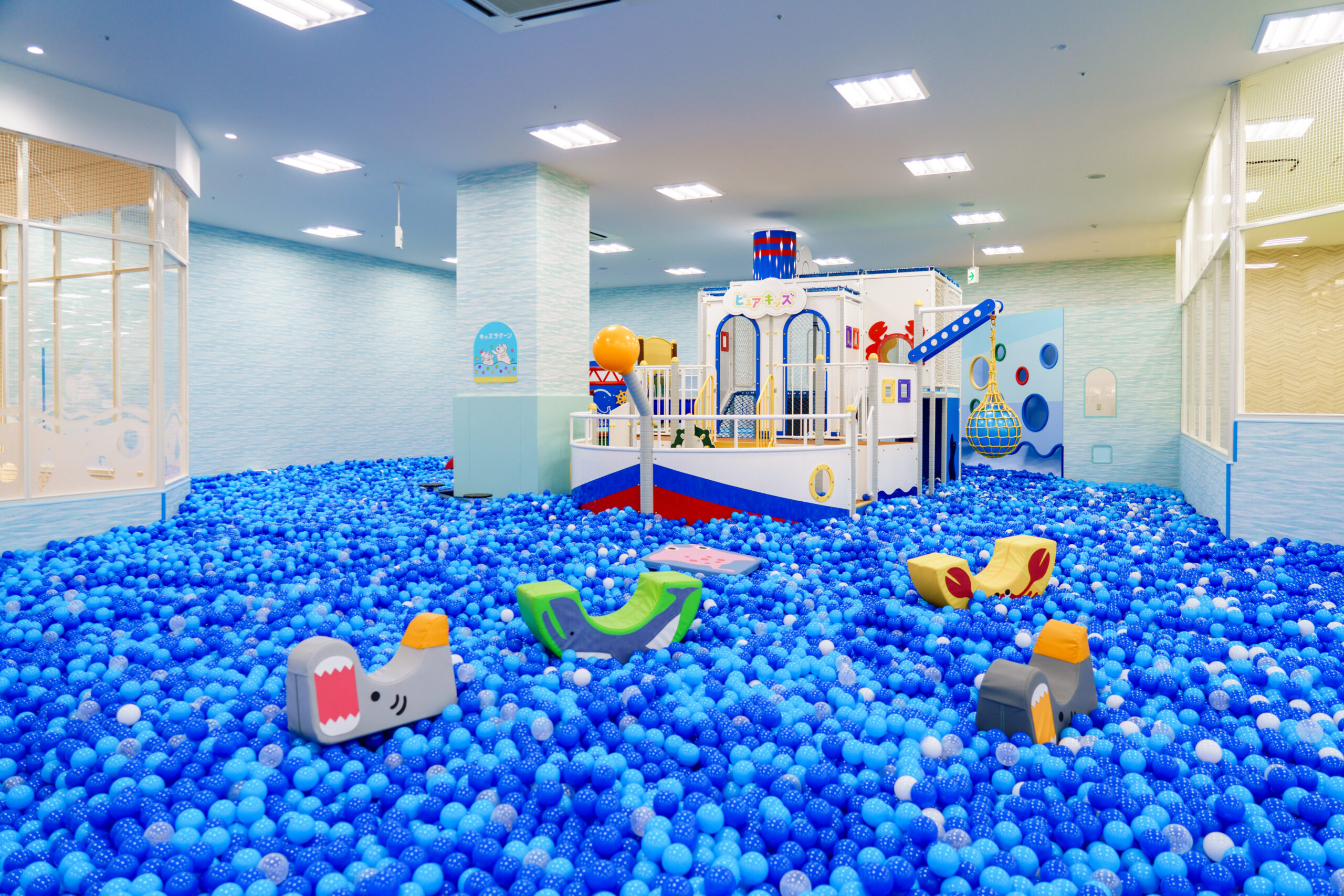 大型ボールプールや船の滑り台、ふわふわ遊具の滑り台があるよ。